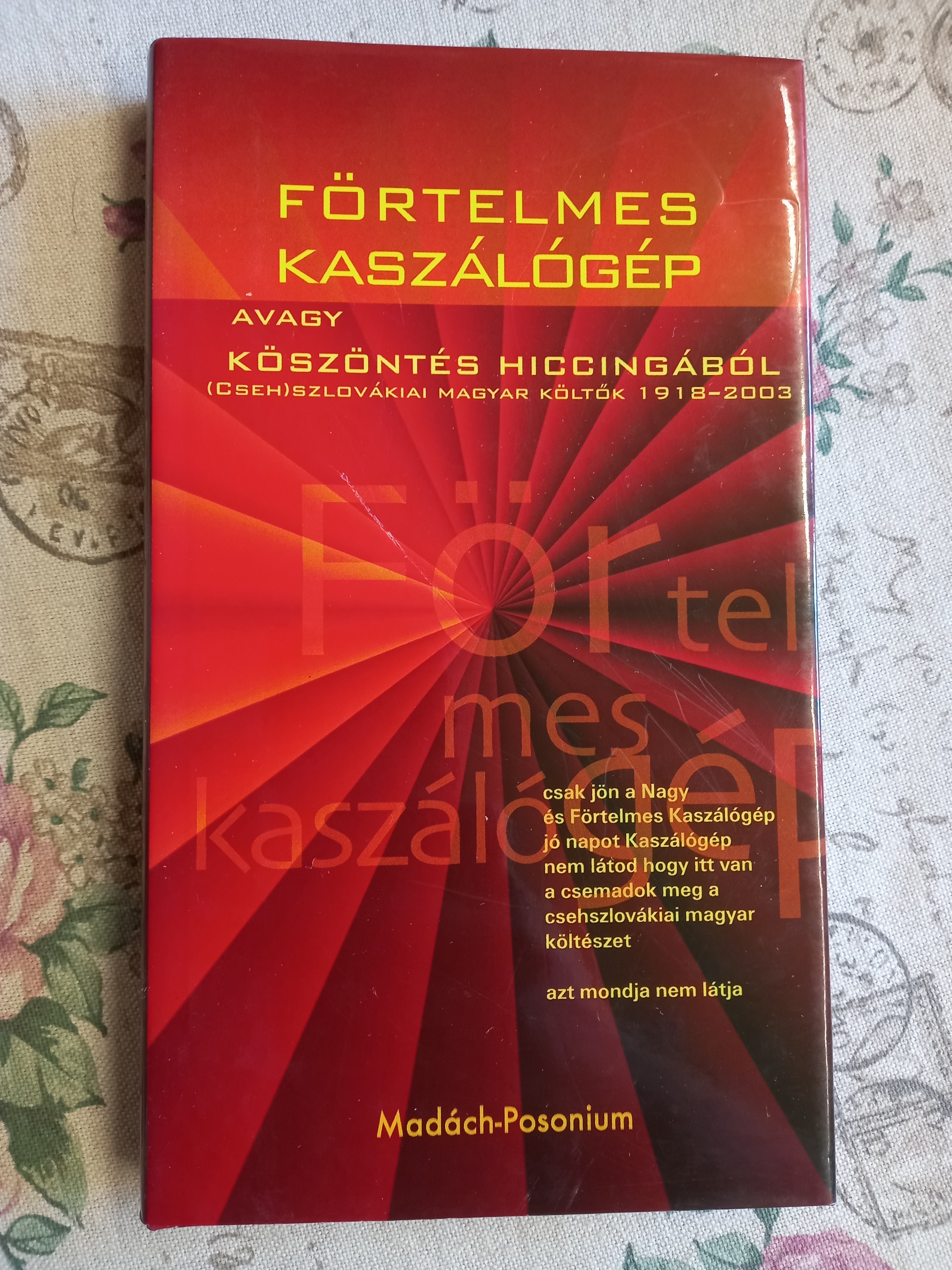 Förtelmes kaszálógépAvagy köszöntés hiccigábólSzerző: Tóth LászlóKiadó: Madách- PosoniumKiadás ideje: 2003Állapot: jóRaktáron10.00 €6.00 € Mennyiség * FacebookHasonló termékekHídTemesi Ferenc5.00 €9.00 €PorTemesi Ferenc12.00 €25.00 €SzínművekGyurkovics Tibor12.00 €30.10 €Ők is boldogan éltek? A férfi változatMagyar irodalom - 21. századi enciklopédia7.00 €12.50 €A napisten fiaiHunyady József4.00 €HajdútáncSzántó György8.00 €Oszlopos Simeon, Az elveszett paradicsom, A gyávaSarkadi Imre3.00 €A néma leventeTamási ÁronBródy SándorMolnár FerencHeltai JenőFüst Milán3.00 €Válogatott versekJózsef Attila3.00 €Szerző: Tóth LászlóKiadó: Madách- PosoniumKiadás ideje: 2003Kiadás helye: BratislavaNyelv: MagyarÁllapot: jóKötés: keménytáblás kötésOldalszám: 300Súly: 0.50 kg